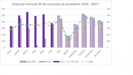 El incremento en el número de concursos declarados comenzó a ser notable a partir del segundo semestre de 2020. Partiendo de un escenario macroeconómico base, incluyendo la extensión de las políticas de apoyo fiscal hasta fin de año y la prórroga de la no obligatoriedad de presentar concurso nuevamente hasta 31 de diciembre 2021, se prevé que las insolvencias empresariales se moderen en el segundo semestre, cerrando 2021 con un crecimiento medio del 30%, según el informe.