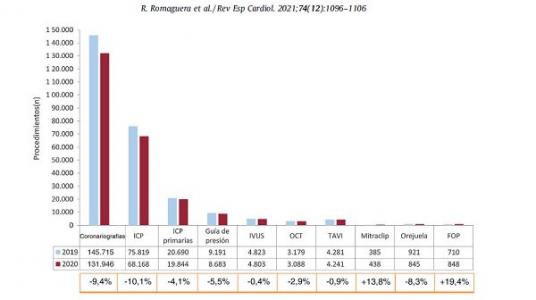 De entre todos los procedimientos, los que mayores descensos han registrado han sido las intervenciones percutáneas no emergentes y los cateterismos diagnósticos. Por el contrario, los que menor caída han sufrido han sido algunos procedimientos estructurales como el implante percutáneo de la válvula aórtica (TAVI), del que se ha registrado una caída de solo un 0,9 por ciento mientras que otros incluso han incrementado. Es el caso de la reparación mitral con clip, y el cierre del foramen oval permeable, con subidas del 13,8 por ciento y del 19,4 por ciento, respectivamente.