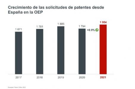 Las solicitudes de patente de España en la Oficina Europea de Patentes (OEP) crecieron un 8,9% en 2021, la tasa de crecimiento más alta de los últimos diez años, tras descender un 4,8% en el año anterior, según el Índice de Patentes de la OEP 2021, publicado este martes.
