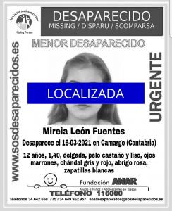 La menor de 12 años que llevaba desaparecida desde el pasado 16 de marzo en Camargo (Cantabria) ha sido localizada en buen estado, según ha confirmado este martes la asociación SOS Desaparecidos a Europa Press.