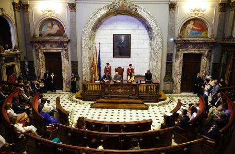 Compromís, con nueve concejales, se ha situado en el mismo lugar que la legislatura anterior, a la izquierda del salón de plenos. En el otro extremo que Compromís, a la derecha del hemiciclo, se han ubicado los 13 ediles del PP. El centro del Hemiciclo lo han ocupado los siete concejales del PSPV, y detrás de ellos, los cuatro representantes de Vox.