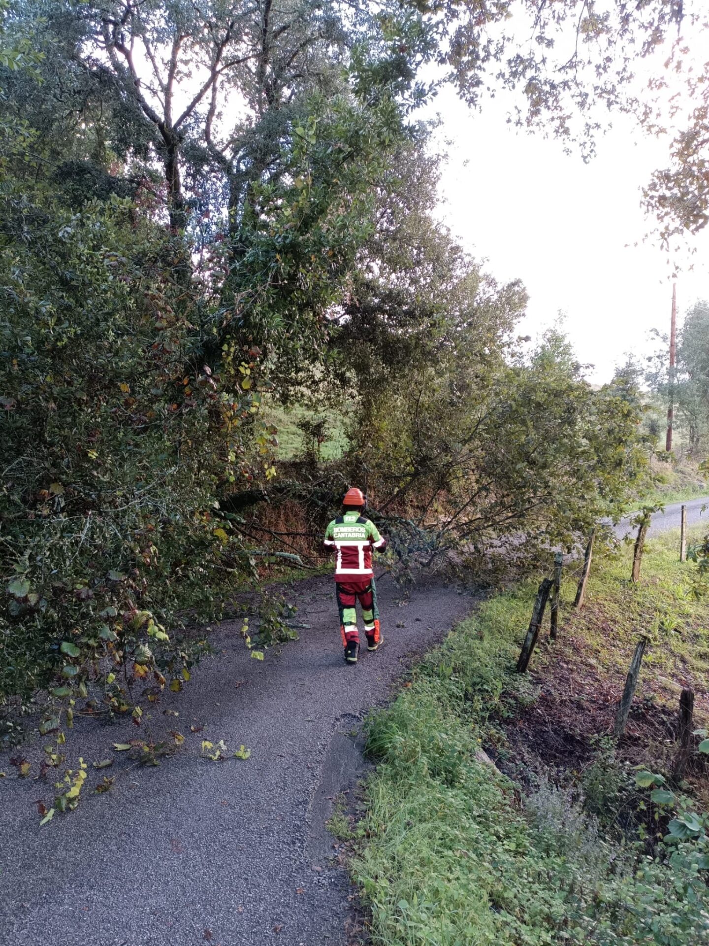 Los Bomberos del 112 retiraron este martes por la tarde varios árboles caídos sobre un cableado telefónico que impedían el paso al barrio de Llanez, en la localidad de San Mamés de Aras (Voto).