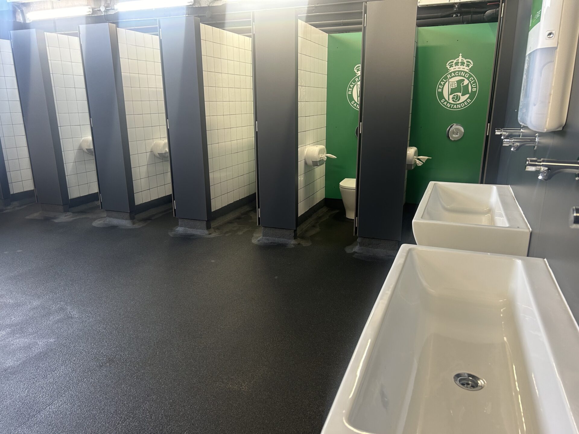 En cuanto a los aseos, se han renovado totalmente, tanto de las zonas públicas como las cabinas interiores. En concreto, se han restaurado 34 unidades –cada una con una media de seis baños independientes–, entre ellos, para personas con discapacidad o para ostomizados. Además, se ha tenido en cuenta la calidad estética –en la que se ha hecho «un guiño» al Racing, con las paredes pintadas de verde y el escudo del Club– así como la facilidad de la limpieza.