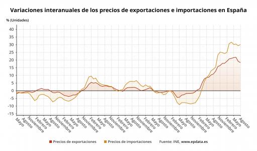 Los precios de exportaciones industriales moderan su alza en agosto al 18,4%, pero suben los de importaciones