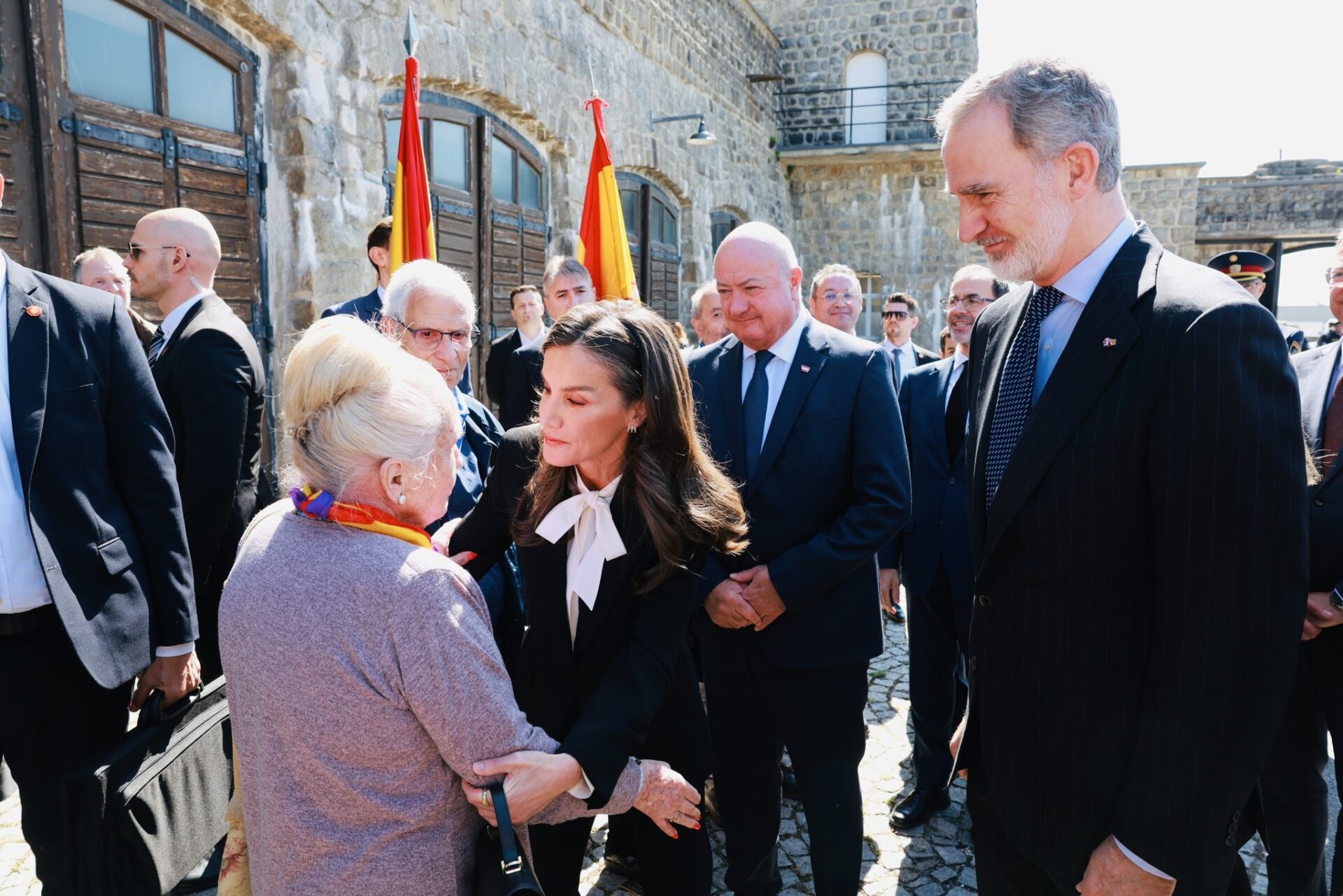Antes de su entrada en el recinto, los monarcas han conversado con Dolors, hija de Josep Pont, que fue uno de los más de 5.000 exterminados en los campos nazis situados en territorio austríaco. La reina la ha rodeado con sus brazos para apoyarla.