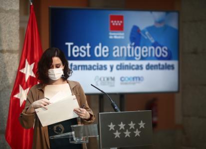 Ayuso ha señalado que la realización de test de antígenos en las oficinas de farmacia y clínicas dentales «es una apuesta más de este gobierno», que, tal y como ha indicado, confía en estos profesionales sanitarios y en la estrategia de test masivos que ha dado «tan buen resultado», en «los momentos más difíciles en la lucha contra la epidemia».