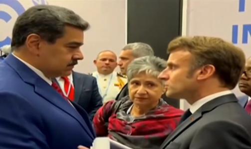 Maduro y Macron se han encontrado en uno de los pasillos de la cumbre climática y se han estrechado largamente la mano. Durante el apretón, Macron ha expresado su deseo de «que pudiéramos hablar un poco más y pudiéramos comenzar un trabajo bilateral que sea útil para el país y la región». Además ha apuntado que «el continente (europeo) se está recomponiendo».
