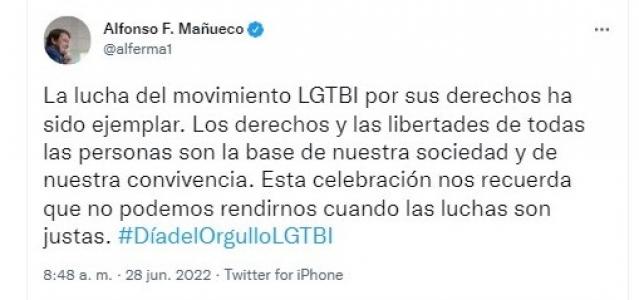 Fernández Mañueco ha lanzado este mensaje de apoyo al colectivo LGTBI a través de un mensaje en su cuenta personal de Twitter en la que se hace eco de la conmemoración este 28 de junio del Día del Orgullo LGTBI.