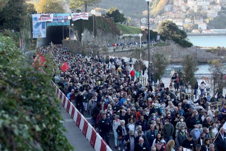 La marcha ha partido pasadas las cinco de la tarde del túnel del Antiguo bajo el lema Ibilian, etxerako bidean ( Paso a paso, en el camino a casa , en euskara). Al inicio de la marcha, miembros del colectivo de víctimas del terrorismo, Covite, encabezados por su presidenta, Consuelo Ordóñez, han colocado en la parte superior del túnel dos pancartas en las que aseguraban que los reclusos de la banda no son «gudaris ni presos políticos», sino «asesinos presos».