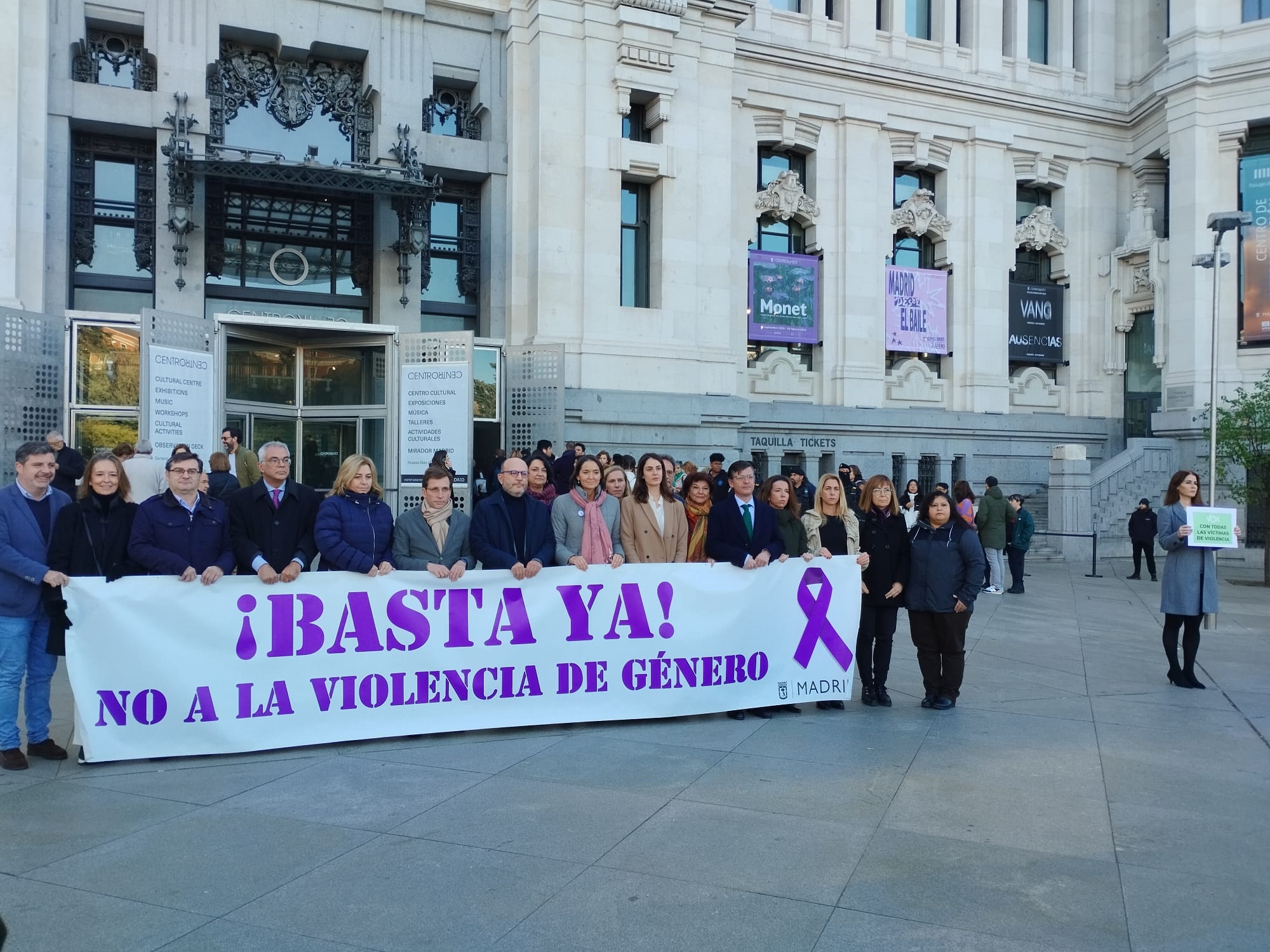 Minutos antes de que todas las formaciones se unieran tras una pancarta contra la violencia de género –excepto Vox, que se ha separado unos metros para portar un cartel en el que se leía que están «con todas las víctimas de la violencia»–, Reyes Maroto ha criticado esa «expulsión» del acto institucional en «un nuevo gesto de totalitarismo y de censura intolerable».