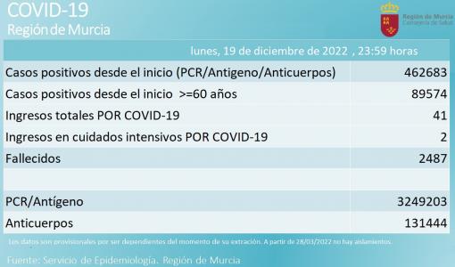 Desde el inicio de la pandemia, la cifra de casos detectados por Salud en la Región ha ascendido hasta los 462.683, de los que 89.574 son personas de 60 o más años, y la de fallecidos se sitúa en 2.487.