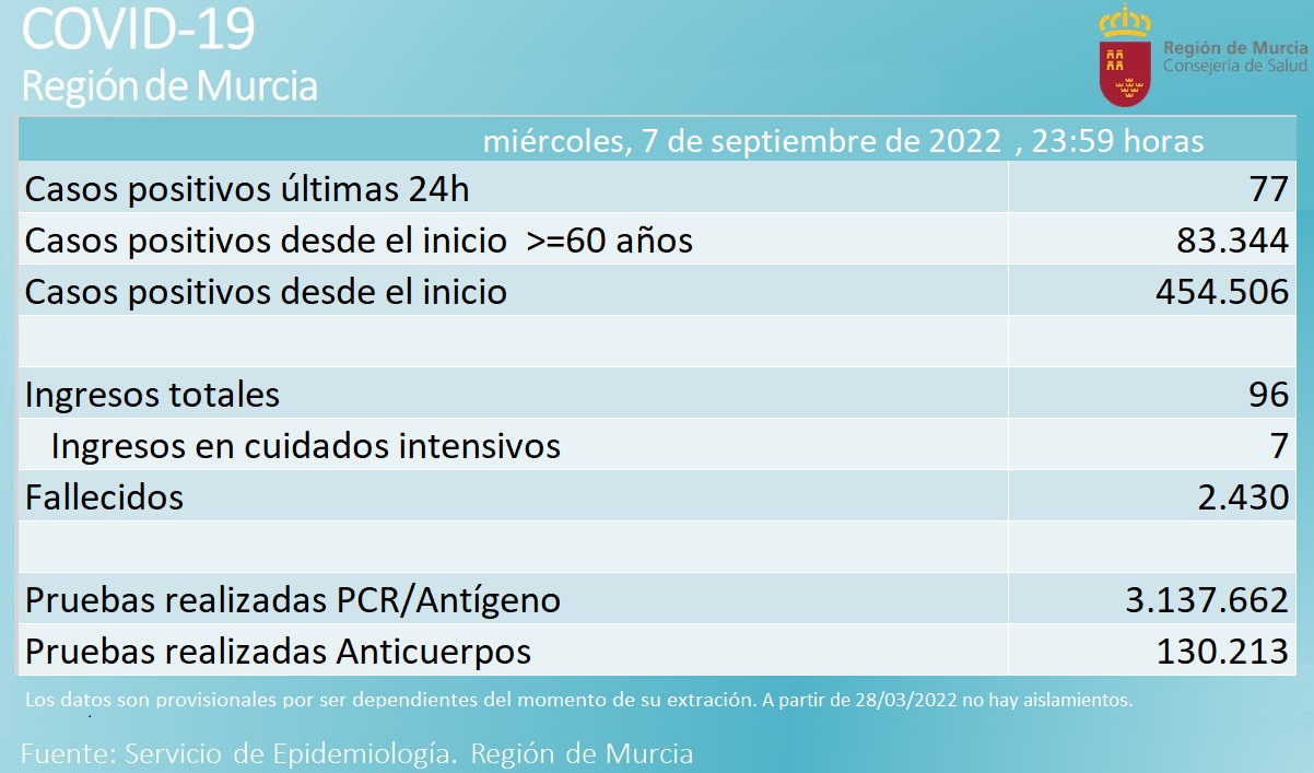 En estos momentos, 96 personas están ingresadas por covid-19 en los hospitales murcianos –doce menos que en el parte ofrecido por el mismo departamento el pasado martes–, siete de ellas en las Unidades de Cuidados Intensivos (UCI), dos menos.