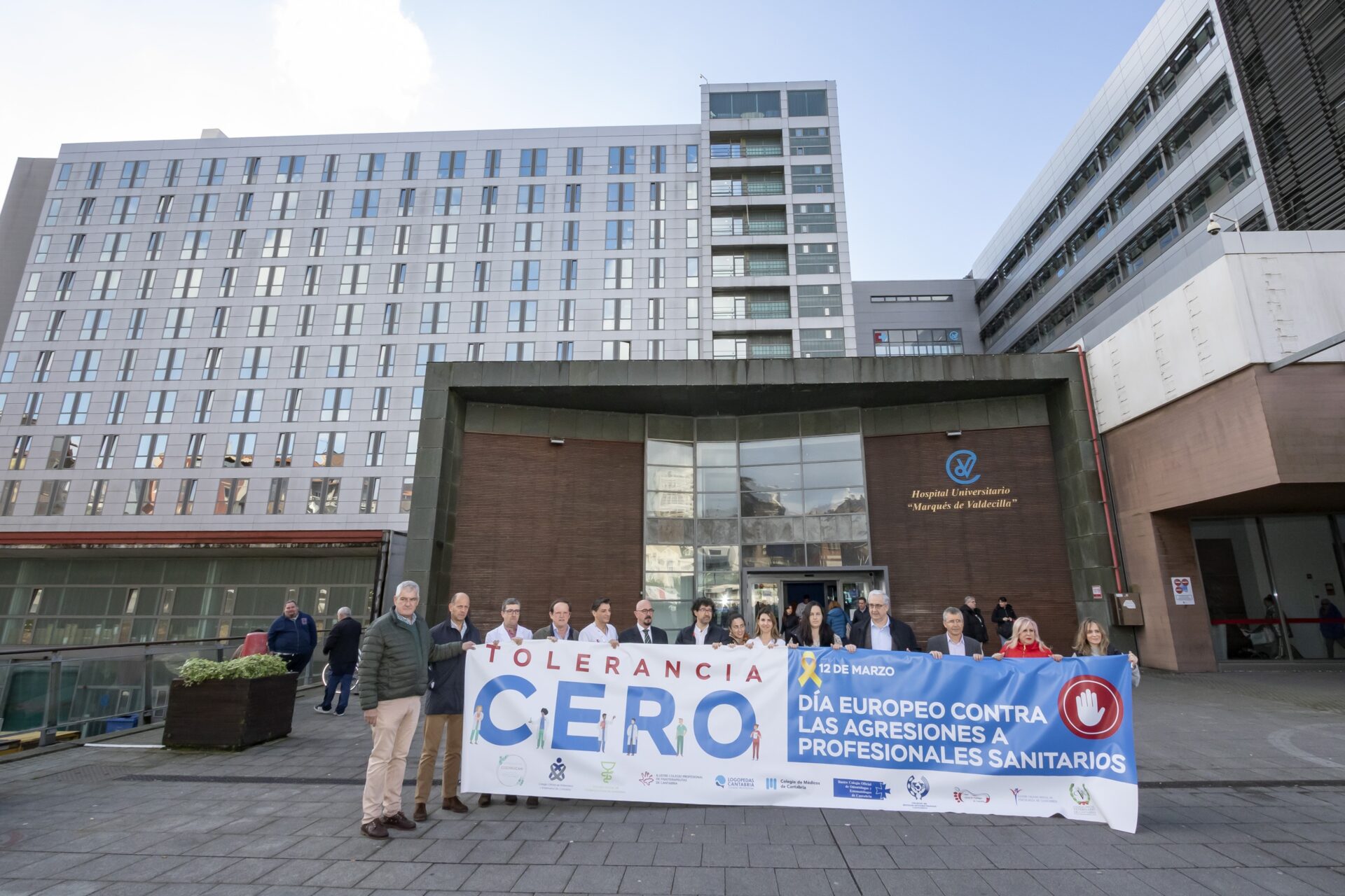 Junto al consejero, han portado la pancarta de Tolerancia Cero responsables de varios de los colegios profesionales sanitarios que forman el Foro Sanitario de Cantabria.