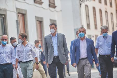 Por la tarde, el presidente del Gobierno, Pedro Sánchez, se incorpora a la jornada de trabajo con una visita a las desaladoras portátiles de Puerto Naos a bordo de un buque de la Armada y otro al barco cisterna.