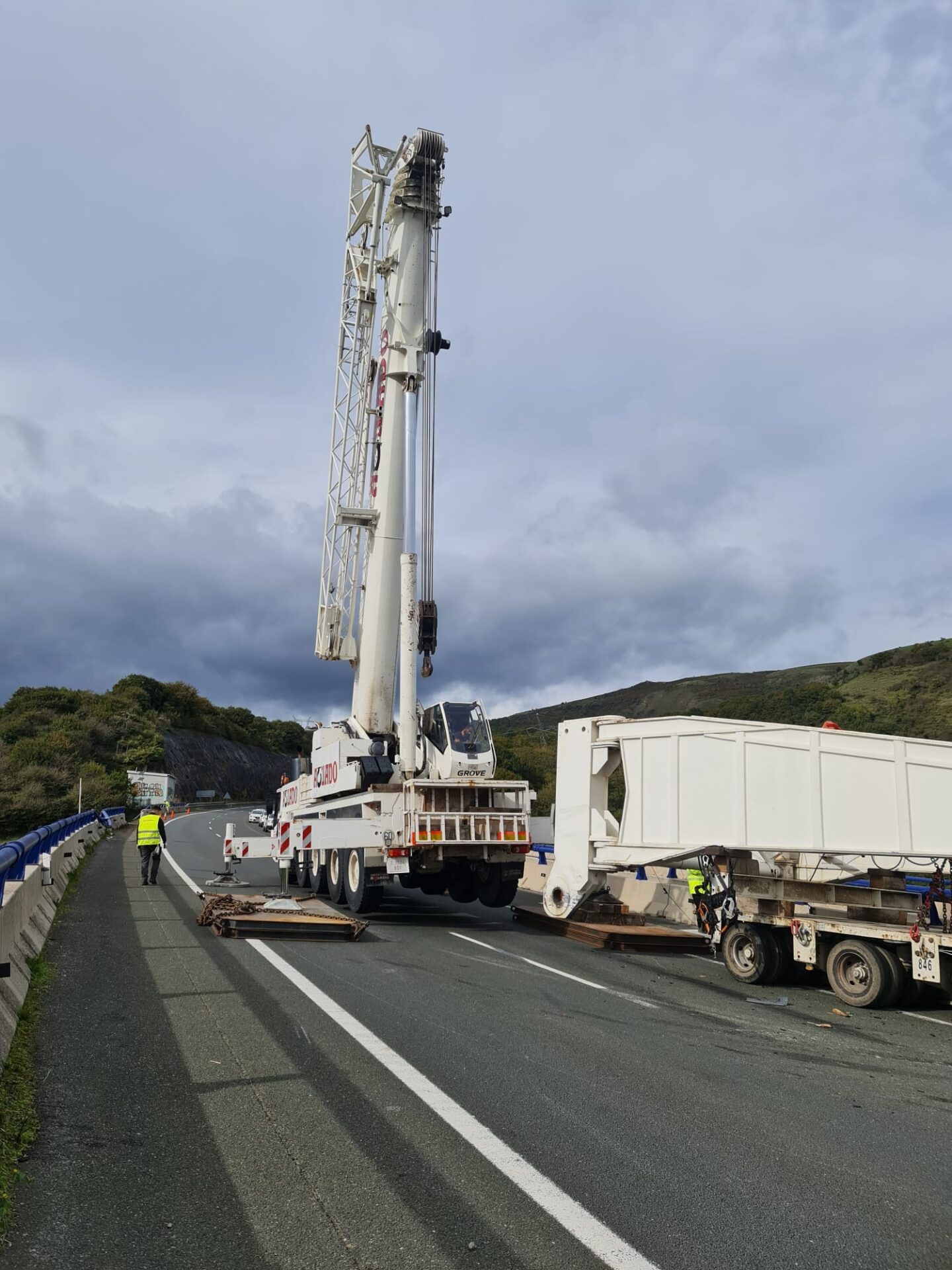 El camión de transporte especial y la pieza que portaba fueron retirados el martes con la intervención de dos grúas de gran tonelaje que fueron instaladas sobre el viaducto de Lantueno.