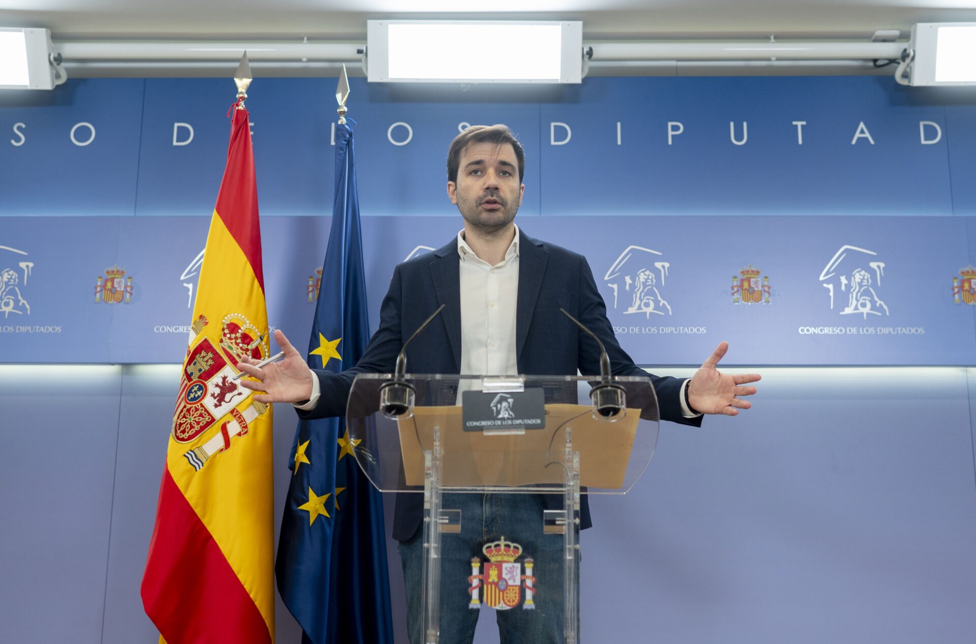 En rueda de prensa en el Congreso, ha afirmado que desconoce las iniciativas que aprobará el Consejo de Ministros, dado que no han contactado con Podemos, y ha avisado de que no puede implicar solo una «simple transposición» europea sobre libertad de prensa.