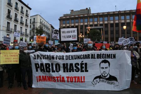 Hasel fue condenado a nueve meses y un día de prisión por la Sala de Apelaciones de la Audiencia Nacional en septiembre de 2018, así como al pago de una multa de aproximadamente 30.000 euros por un delito de enaltecimiento del terrorismo e injurias y calumnias a la monarquía y a las fuerzas de seguridad del Estado tras difundir mensajes atentatorios en redes sociales. Tiene pendiente otra condena de dos años de 2015.