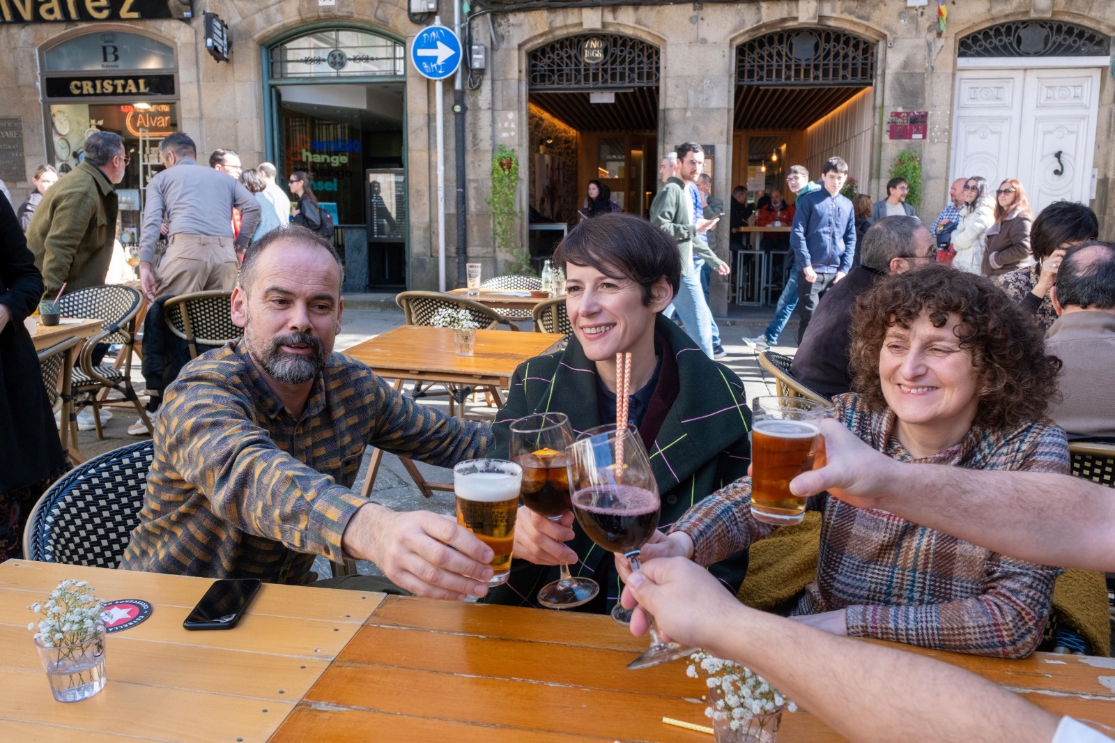 La portavoz nacional del BNG y candidata a la presidencia de la Xunta, Ana Pontón, ha aprovechado la jornada de reflexión para tomar un vermú en un establecimiento de la zona vieja de Santiago de Compostela con familiares y amigos, entre los que se encontraba la alcaldesa de la capital gallega, Goretti Sanmartín.