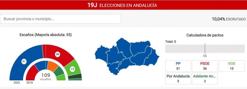 Con el 10% escrutado, el PP gana las elecciones autonómicas en Andalucía y consigue 51 escaños, logrando un 39,57% de los votos. Esta cifra supone 25 más que los 26 parlamentarios obtenidos en los comicios de 2018 y le dejan a cuatro diputados de la mayoría absoluta, fijada en 55 escaños.