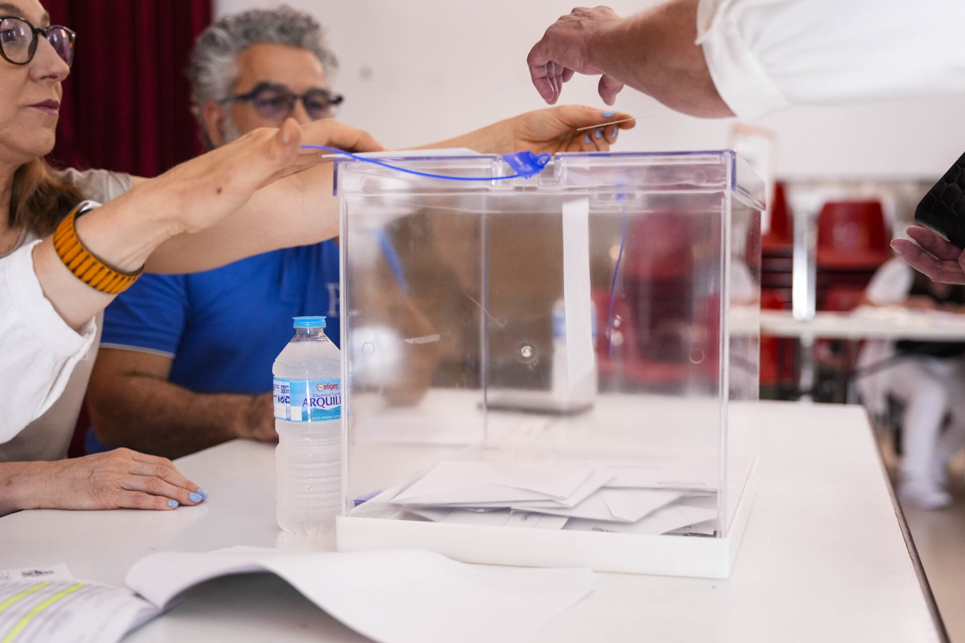 Detalle de la jornada electoral en el Colegio de los Maristas, a 9 de junio de 2024, en Sevilla (Andalucía, España). Hoy tienen lugar las elecciones europeas de 2024 en España. Más de 38 millones de españoles están llamados a pasar por las urnas en unos comicios en los que se eligen a 61 eurodiputados al Parlamento Europeo. El partido político más numeroso es el Partido Popular Europeo, con 177 parlamentarios, seguido del Grupo de la Alianza Progresista de Socialistas y Demócratas (143), mientras que el más pequeño es el grupo de la Izquierda, con 37 representantes.