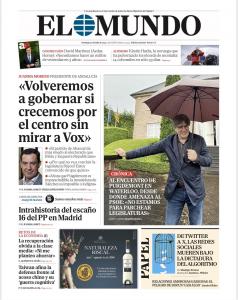 EL MUNDO: «Juanma Moreno: «Volveremos a gobernar si crecemos por el centro sin mirar a Vox»; «Al encuentro de Puigdemont en Waterloo: No estamos para parchear legislaturas»; «Intrahistoria del escaño 16 del PP en Madrid».