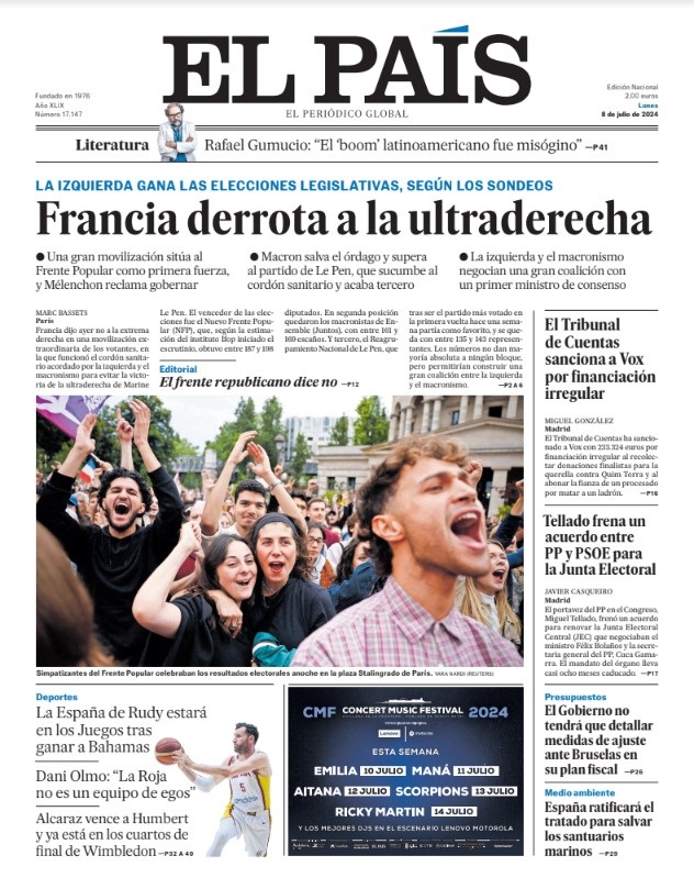 EL PAÍS: «Francia derrota a la ultraderecha»; «El Tribunal de Cuentas sanciona a Vox por financiación irregular»; «Tellado frena un acuerdo entre PP y PSOE para la Junta Electoral»; «El Gobierno no tendrá que detallar medidas de ajuste ante Bruselas en su plan fiscal»; «España ratificará el tratado para salvar los santuarios marinos».