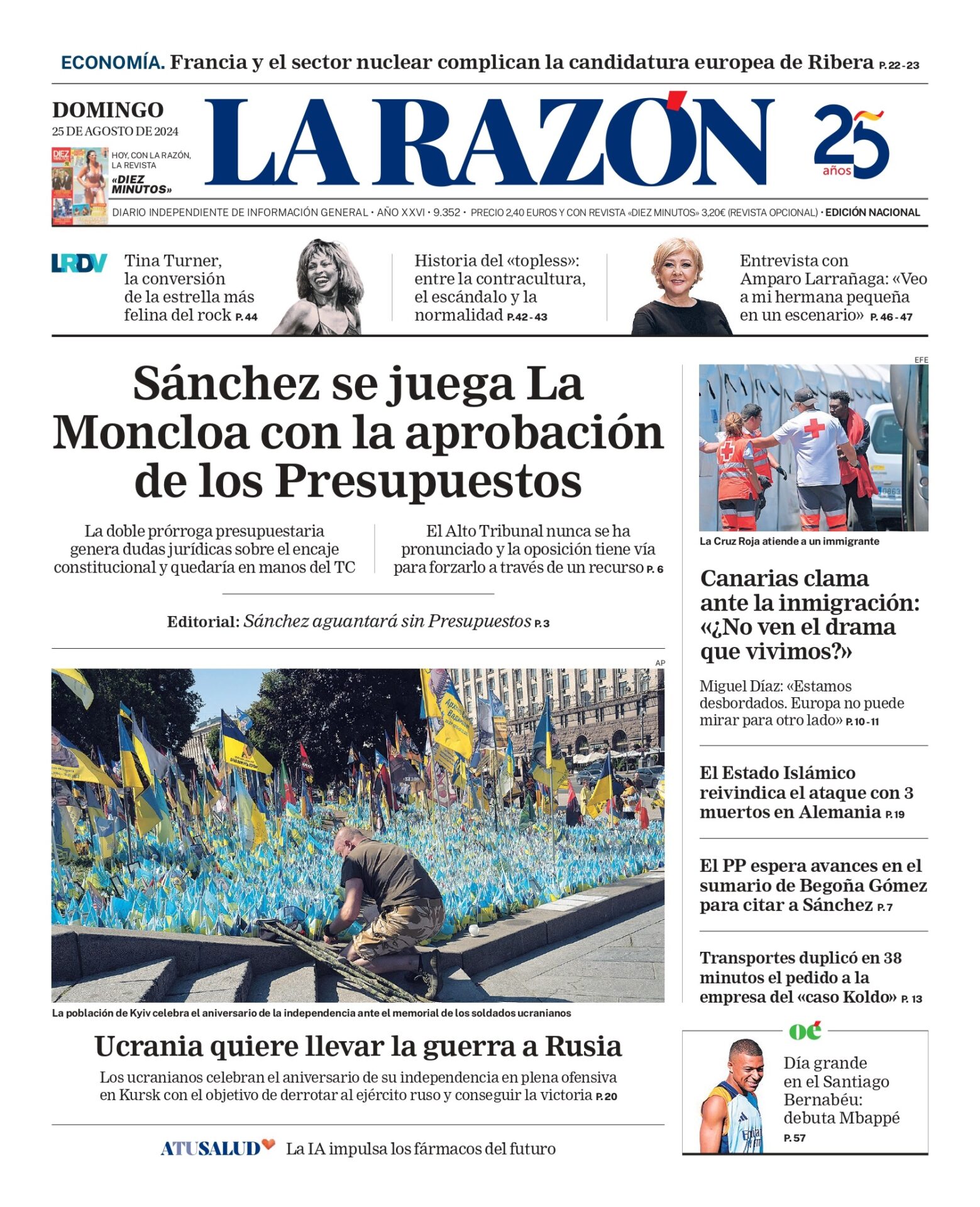 LA RAZÓN: «Sánchez se juega La Moncloa con la aprobación de los Presupuestos La doble prórroga presupuestaria genera dudas jurídicas sobre el encaje constitucional y quedaría en manos del TC»; «El Alto Tribunal nunca se ha pronunciado y la oposición tiene vía para forzarlo a través de un recurso»; «Ucrania quiere llevar la guerra a Rusia»; «Los ucranianos celebran el aniversario de su independencia en plena ofensiva en Kursk con el objetivo de derrotar al ejército ruso y conseguir la victoria».