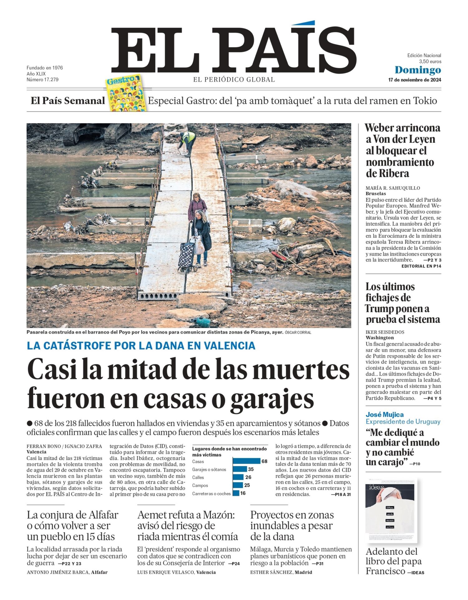EL PAÍS: «Casi la mitad de las muertes fueron en casas y garajes»; «La conjura de Alfafar o cómo volver a ser un pueblo en 15 días»; «Aemet refuta a Mazón: avisó del riesgo de riada mientras él comía»; «Proyectos en zonas inundables a pesar de la dana»; «Weber arrincona a Von der Leyen al bloquear el nombramiento de Ribera»; «Los últimos fichajes de Trump ponen a prueba el sistema».