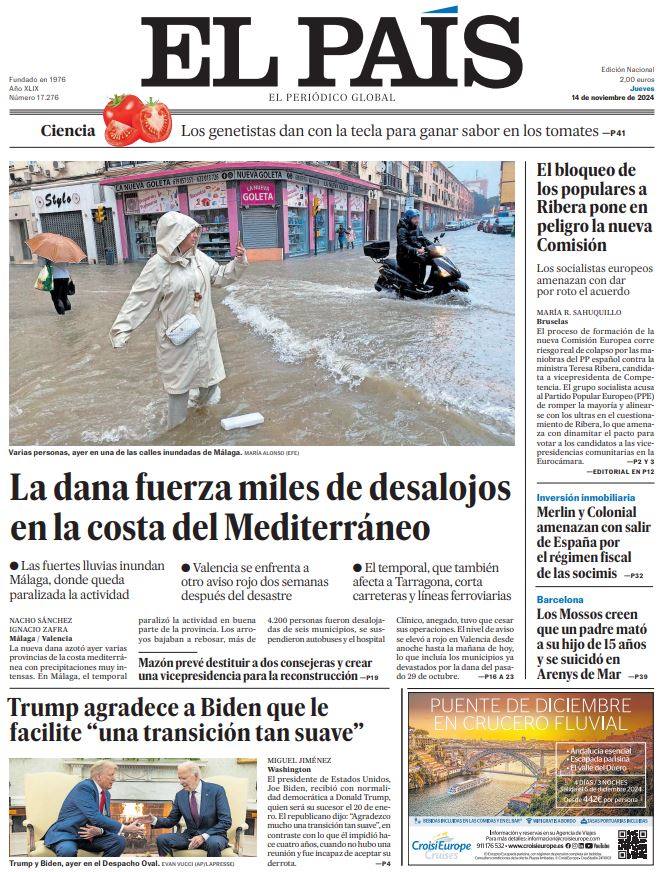 EL PAÍS: «Biden autoriza a Ucrania a atacar Rusia con misiles de largo alcance»; «El retorno de Trump impacta en el G-20 y en la cumbre del clima»; «Los obispos se reúnen para zanjar el escándalo de los abusos»; «La víctima de un kamikaze: «Pensé ahora sonará un crac y moriré»»; «Mazón acomete la crisis de Gobierno en busca de su supervivencia»; «Malestar en las Fuerzas Armadas con el presidente autonómico»; «Cruzar medio mundo para perder todo en las riadas»; «La espiral con trampa de los créditos rápidos».
