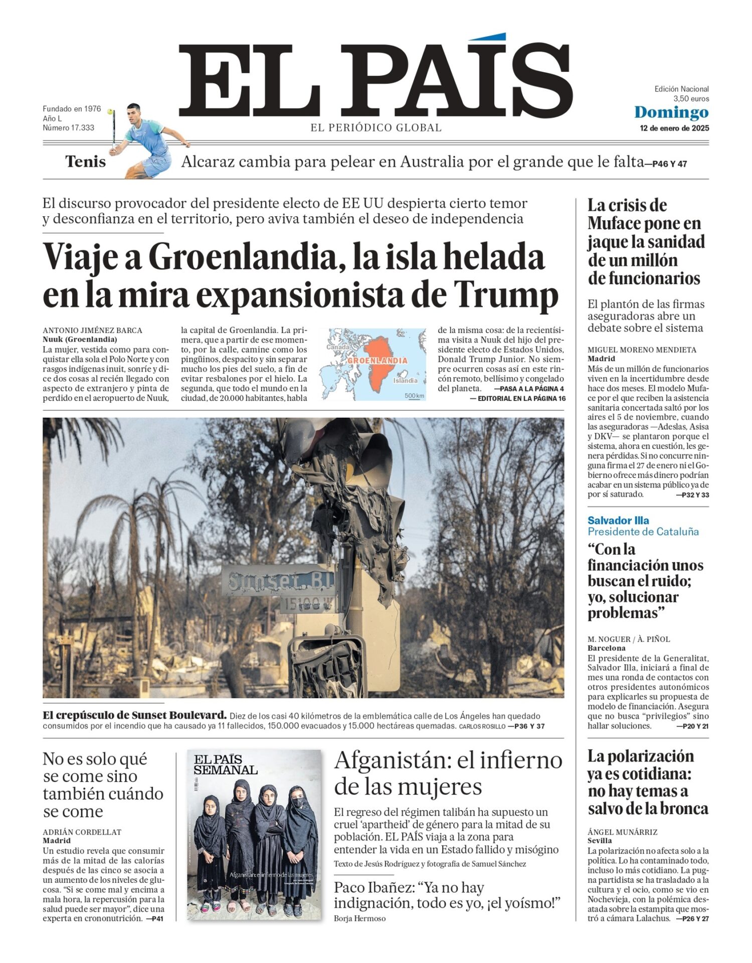 EL PAÍS: «Viaje a Groenlandia, la isla helada en la mira expansionista de Trump»; «La crisis de Muface pone en jaque la sanidad de un millón de funcionarios»; «Salvador Illa: Con la financiación unos buscan el ruido; yo, solucionar problemas «; «La polarización ya es cotidiana: no hay temas a salvo de la bronca»; «Afganistán: el infierno de las mujeres»; «Paco Ibañez: Ya no hay indignación, todo es yo, ¡el yoísmo «; «Alcaraz cambia para pelear en Australia por el grande que le falta».