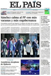 EL PAÍS: «Sánchez calma al PP con más vacunas y más cogobernanza»; «Asombroso desplome de Djokovic. Seis mujeres vuelan a la final de los 100 metros lisos con marcas fabulosas. Ricky Rubio, motor de España en Tokio, inmerso en otro baile de traspasos en la NBA»; «El Tribunal de Cuentas reclama a UGT 9,7 millones por el caso ERE «; «Los contagios por covid en las residencias se multiplican por ocho en 14 días»; «El Gobierno y la oposición de Venezuela buscan en México salida a la crisis del país».