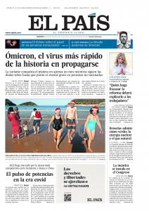 EL PAÍS: «Ómnicron, el virus más rápido de la historia en propagarse»; «Yolanda Díaz, vicepresidenta segunda y ministra de Trabajo: Quien haga fracasar la reforma laboral deberá explicarlo a los trabajadores «; «Bruselas admite como verdes la energía nuclear y el gas natural»; «Año nuevo en la playa con temperaturas de abril»; «El pulso de potencias en la era Covid»; «La mentira se instala en el Congreso».