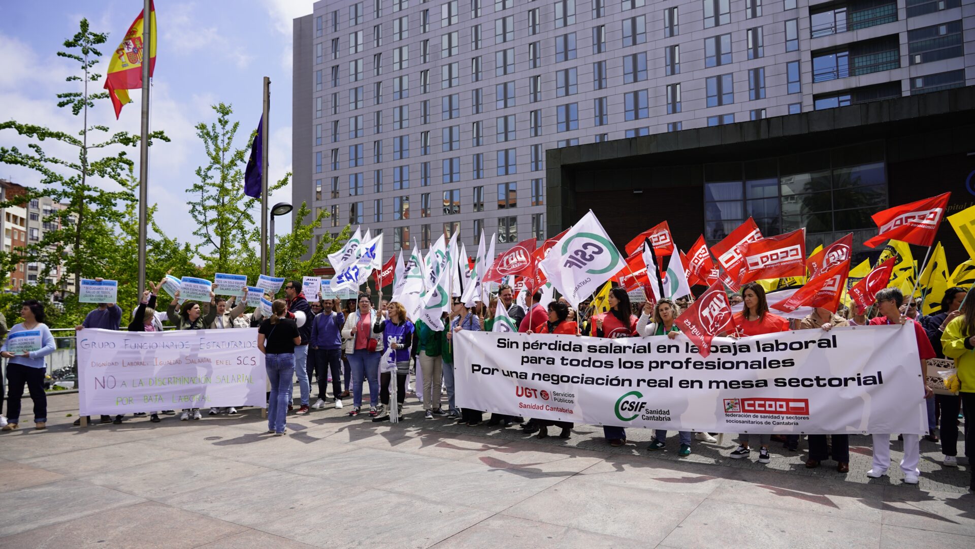 En el caso del Hospital Valdecilla, los profesionales del Servicio Cántabro de Salud (SCS) han portado pancartas en las que pedían una Negociación real en la mesa sectorial y Dignidad laboral , y denunciaban Discriminación salarial por baja laboral , al tiempo que gritaban Pascual vete ya , en referencia al consejero de Salud.