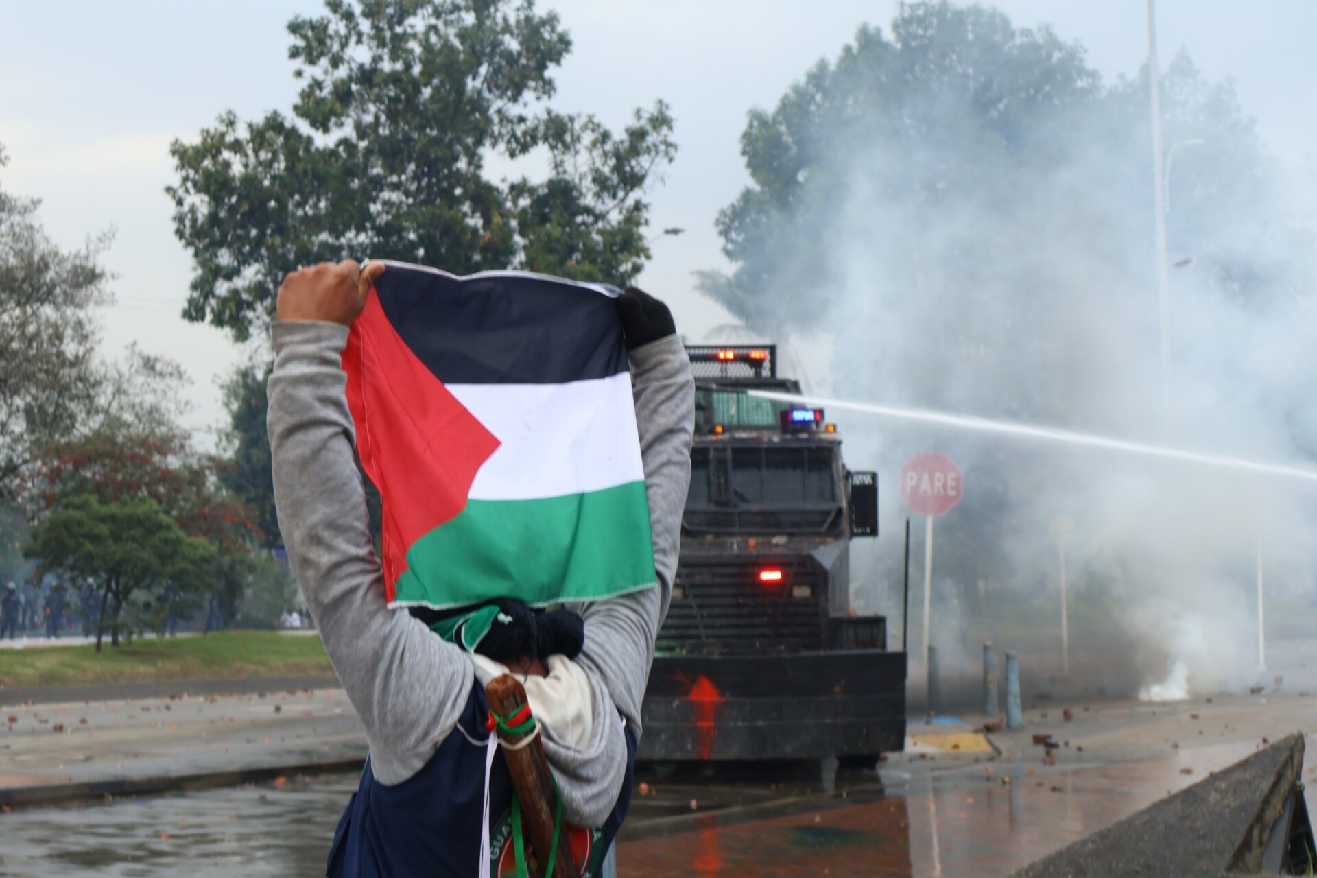 En medio de los enfrentamientos, el presidente de Colombia, Gustavo Petro, confirmó la activación de un protocolo de emergencia para proteger la sede diplomática estadounidense y acusó a una facción radical de la organización indígena Congreso de los Pueblos de iniciar los disturbios.