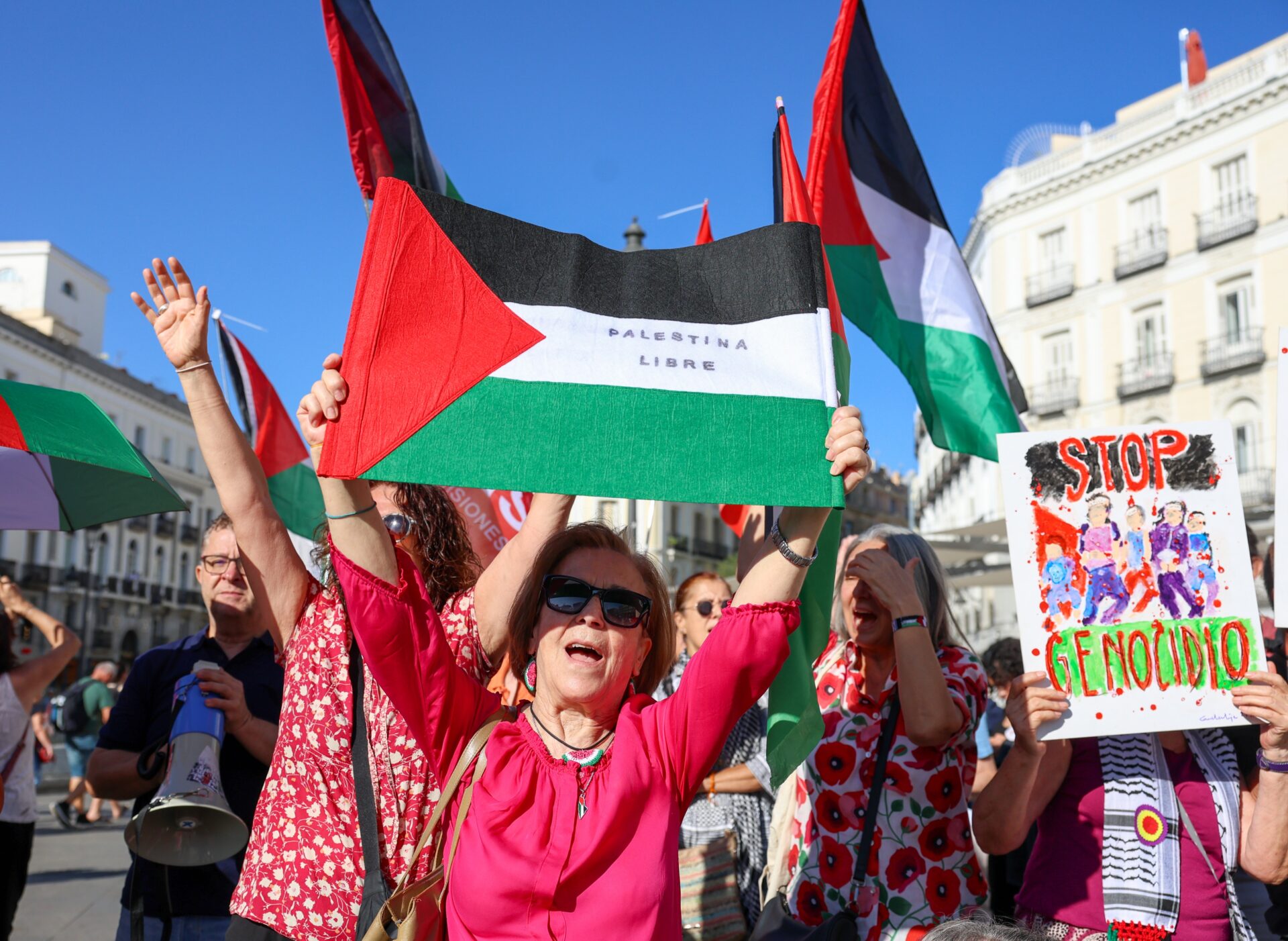 En Madrid, la céntrica Puerta del Sol ha acogido la protesta donde un grupo de ciudadanos se ha manifestado en apoyo a Palestina, el mismo día en el que el Consejo de Ministros ha aprobado el decreto con las nueve medidas anunciadas por el presidente Pedro Sánchez para frenar el «genocidio». Se han ondeado banderas palestinas pidiendo «justicia y paz» o recordando que en Gaza «no hay vuelta al cole».