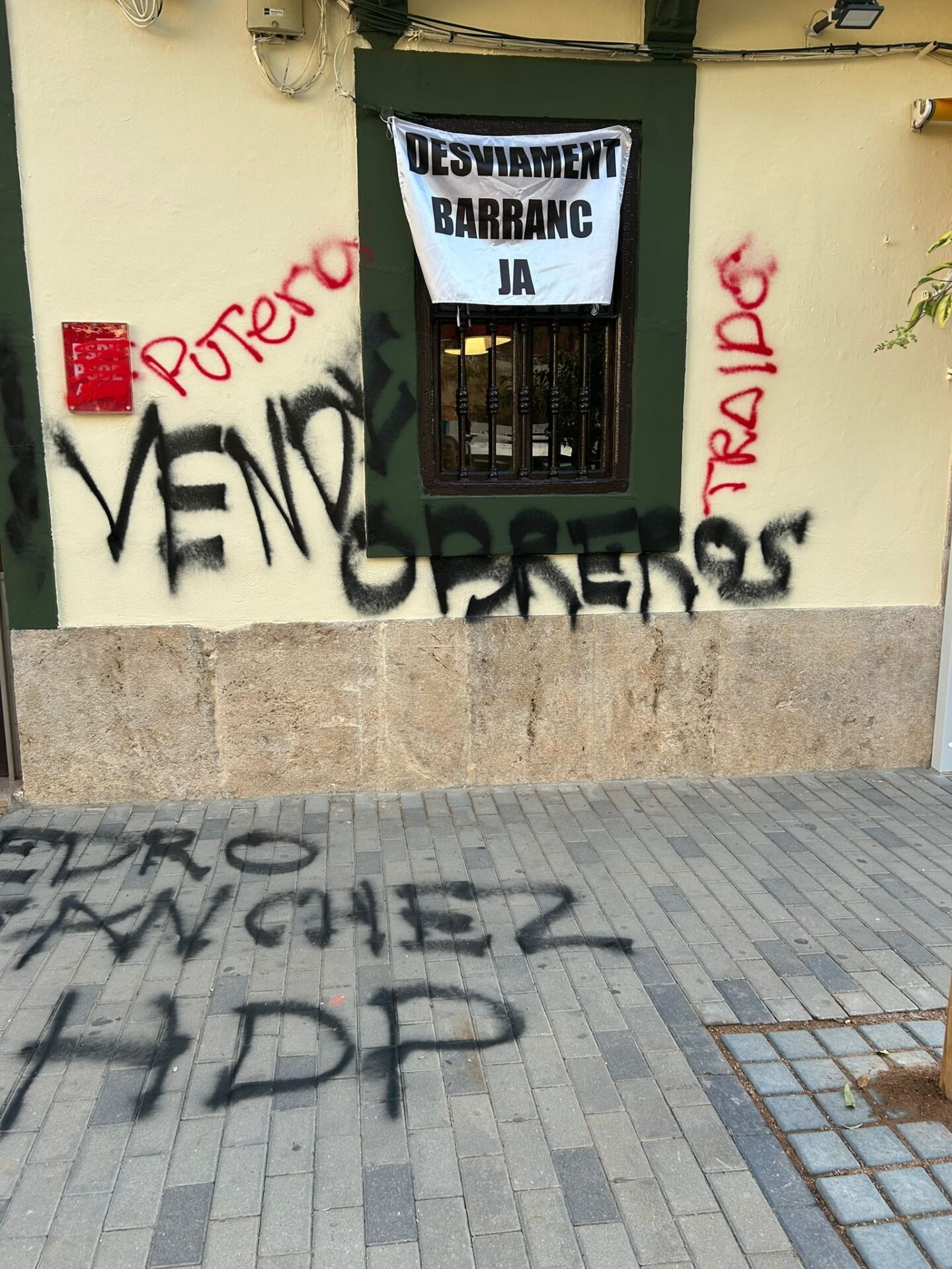 Este sábado, la sede del PSPV-PSOE en la localidad valenciana de Aldaia ha amanecido con diversas pintadas. En concreto, el cartel del PSPV-PSOE ha sido tachado, en la puerta se pueden leer pintadas de corrupto y puteros , mientras que en la pared han escrito vendeobreros o traidor . En el suelo también hay una pintada de Pedro Sánchez HDP .