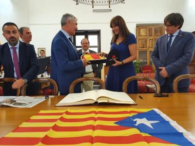 También ha firmado el libro de honor del consistorio y ha agradecido la visita obsequiando una réplica hecha a mano de la bandera del Parlament de Cataluña.