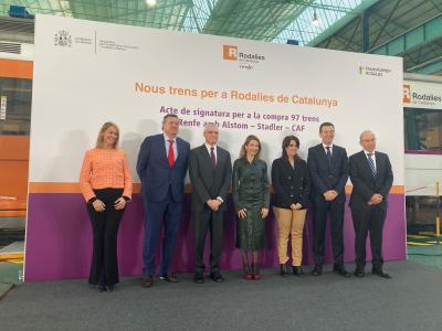 En la firma han participado los presidentes de Alstom, Leopoldo Maestu, y Stadler, Íñigo Parra, y el consejero delegado de CAF, Javier Martínez, y ha contado con la presencia de la ministra de Transportes, Movilidad y Agenda Urbana, Raquel Sánchez, y la delegada del Gobierno en Cataluña, Maria Eugènia Gay.