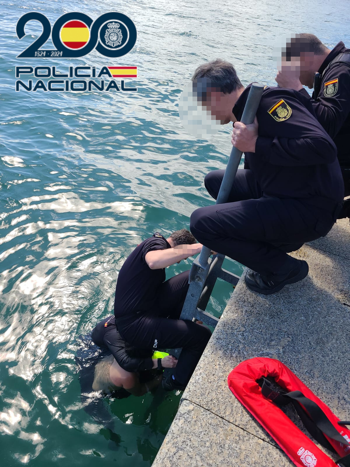 Finalmente, y como cada vez presentaba más síntomas de hipotermia y de aturdimiento, la policía se introdujo en el agua y consiguió colocarle un salvavidas y acercarla hasta la base de la escalera, desde donde el resto de agentes pudieron sujetarla por los brazos y sacarla del agua. Le colocaron una manta térmica e intentaron tranquilizarla hasta la llegada de los servicios sanitarios.