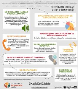 Para informar adecuadamente sobre suicidio, la Confederación aconseja consultar la guía de Recomendaciones para el tratamiento del suicidio por los medios de comunicación , elaborada por el Ministerio de Sanidad.