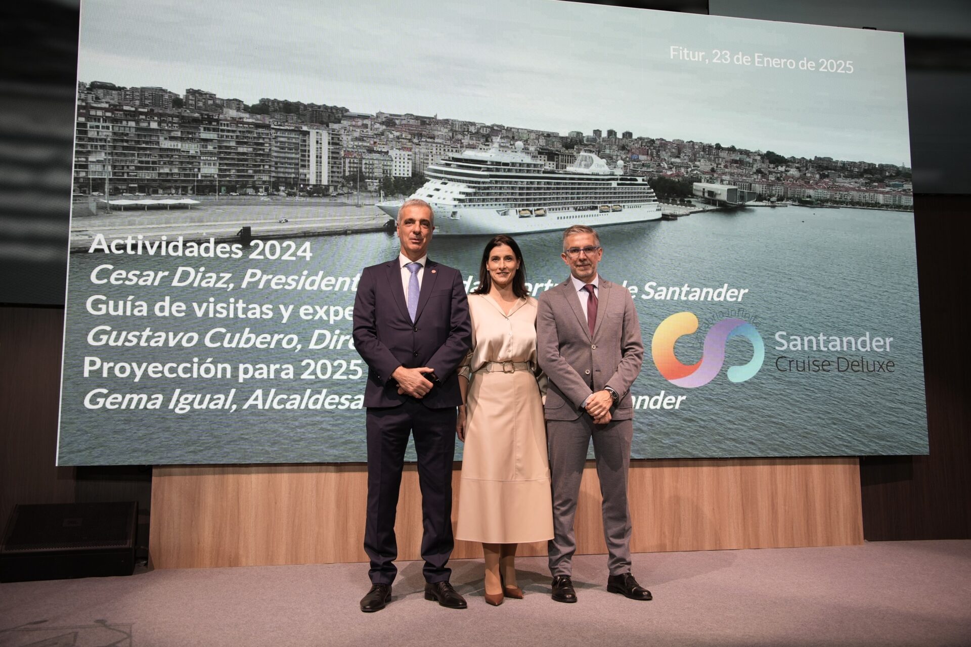 En el acto en Fitur para presentar las acciones que está implementando Santander Cruise Deluxe para lograr su objetivo de captación de cruceros se han dado cita los representantes de las tres administraciones que componen la marca: el presidente de la Autoridad Portuaria de Santander (APS), César Díaz; la alcaldesa de Santander, Gema Igual, y el director general de turismo del Gobierno de Cantabria, Gustavo Cubero.