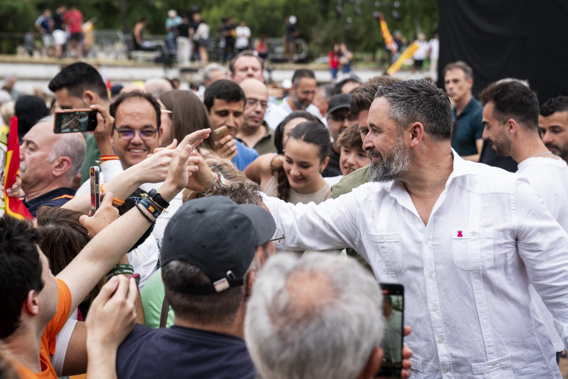 Santiago Abascal llega a la sede nacional de Vox para seguir la noche electoral del 9J