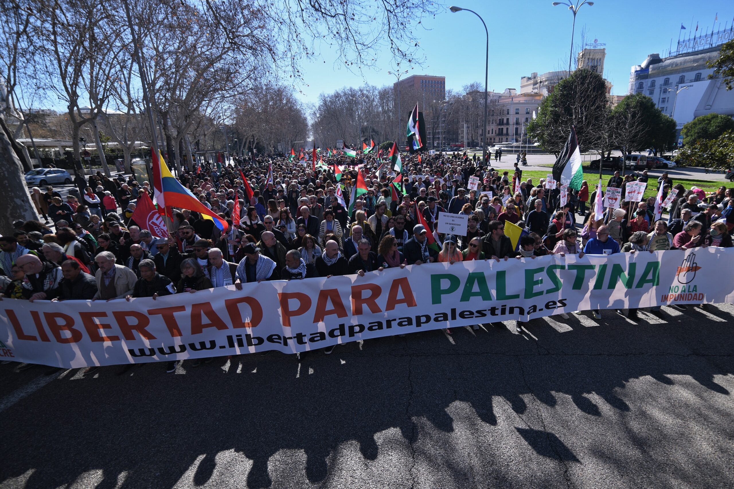 La marcha, bajo el lema Libertad para Palestina, no a la impunidad, fin a la masacre , ha transcurrido entre la estación de Atocha y la Puerta del Sol, y ha sido convocada por una treintena de organizaciones políticas, sindicales y ciudadanas entre las que figuran Sumar, Izquierda Unida, UGT y Comisiones Obreras.