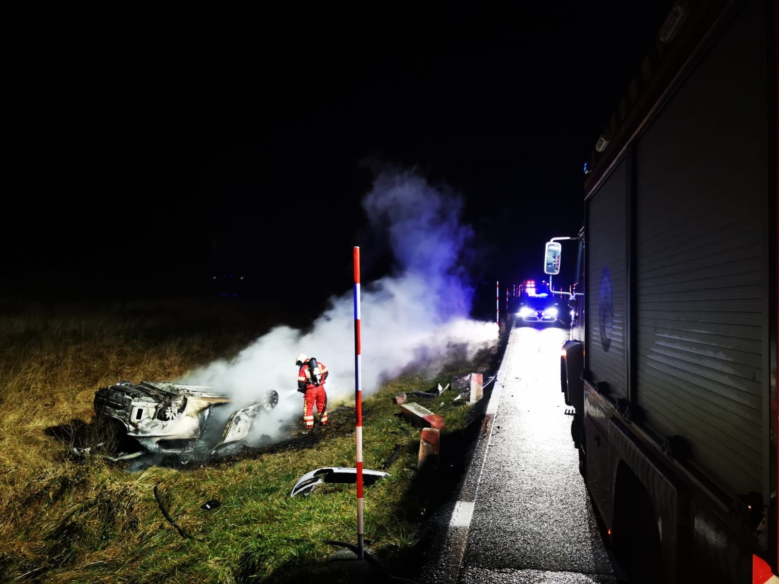 Se incendia un vehículo en la N-629 en Soba tras salirse de la vía y volcar