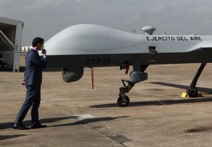 Sánchez conoce los nuevos aviones no tripulados del Ejército del Aire en la base aérea de Talavera la Real (Badajoz)