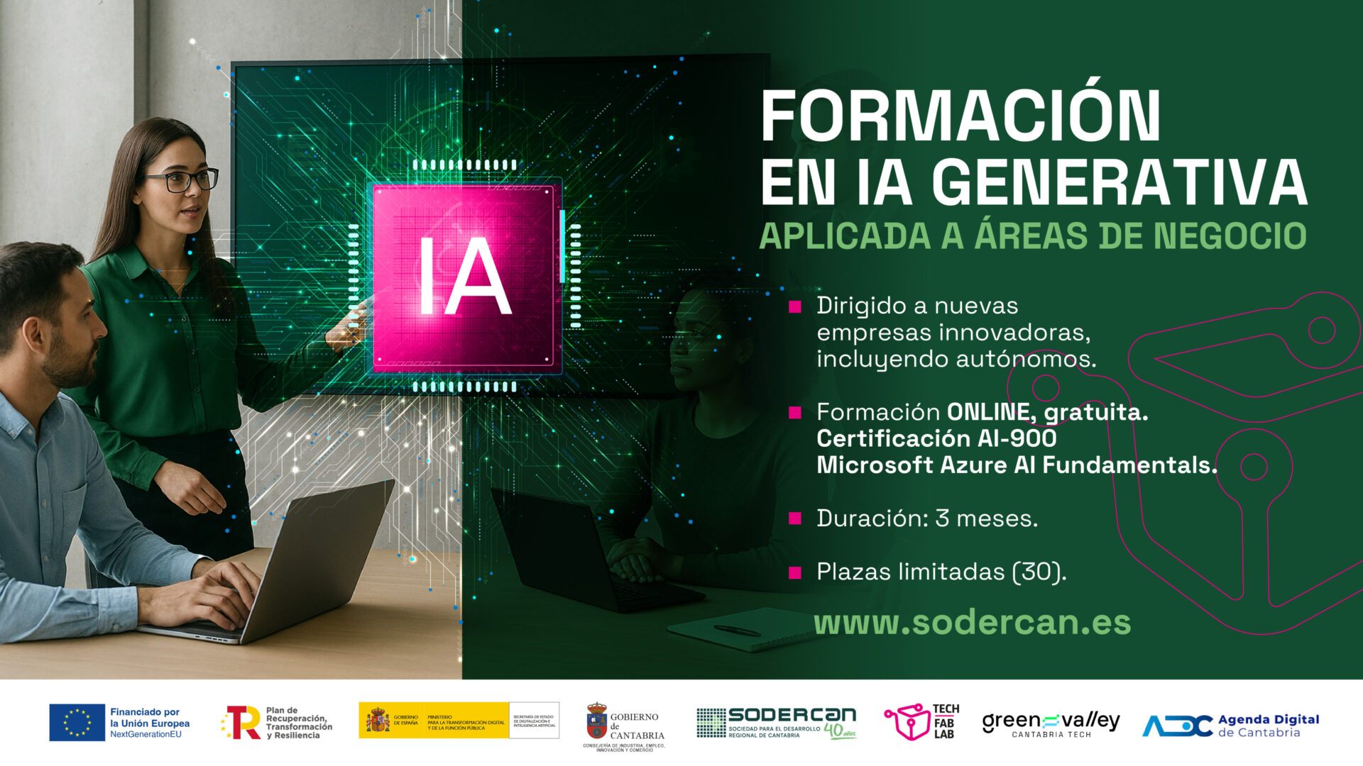 La Sociedad para el Desarrollo de Cantabria, SODERCAN, adscrita a la Consejería de Industria, Empleo, Innovación y Comercio, ha diseñado un programa de formación en Inteligencia Artificial generativa aplicada a áreas de negocio que incluye los conocimientos necesarios para obtener la certificación AI-900 de Microsoft Azure AI Fundamentals.