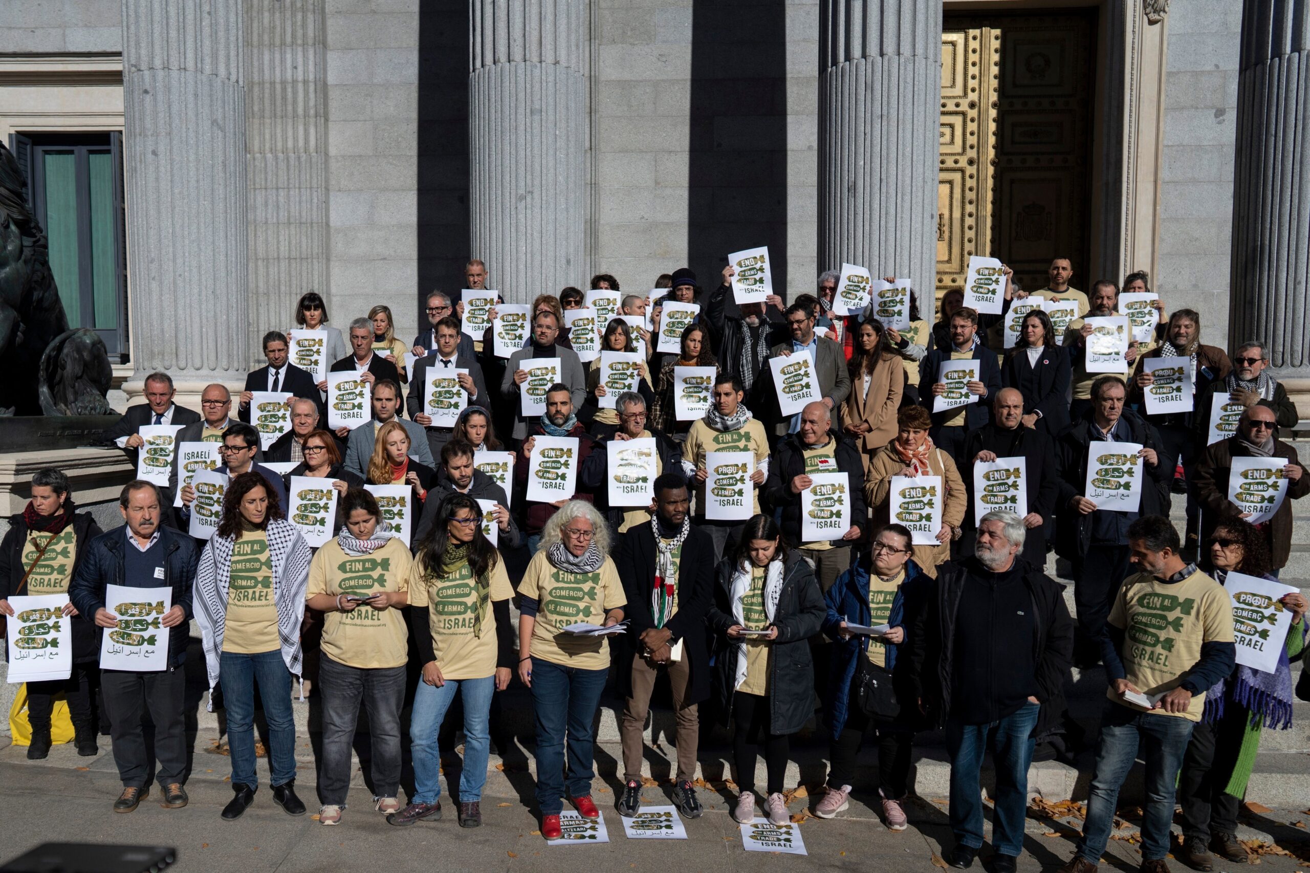 Diputados de Sumar, Podemos, ERC, Bildu y BNG, todos ellos socios de investidura de Pedro Sánchez, se han concentrado este jueves a las puertas del Congreso junto con representantes de 375 entidades ente sindicatos y ONG apoyando el llamamiento Fin al Comercio de armas con Israel con el objetivo de pedir al Gobierno que finalice inmediatamente la compra y venta de armamento y equipamiento de seguridad con Israel.