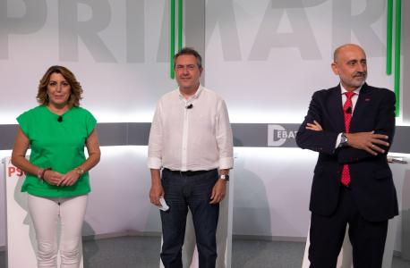 Susana Díaz, Juan Espadas y Luis Ángel Hierro han participado, desde las 20,00 horas de este martes, en la sede regional del partido, en la calle San Vicente de Sevilla, en un debate a tres, el único contemplado por ahora durante la campaña informativa puesta en marcha durante este proceso, que tiene en el próximo domingo, 13 de junio, su jornada de votación.