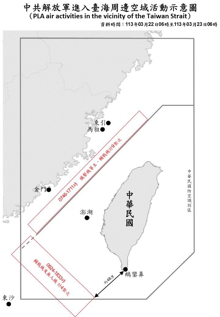 El Ministerio de Defensa taiwanés ha indicado que a las 6.00 horas (hora local) se ha registrado la presencia de 13 aviones alrededor de Taiwán y que cuatro de ellos han cruzado la línea media del estrecho de Taiwán y han entrado en la zona de identificación de defensa aérea de la isla.