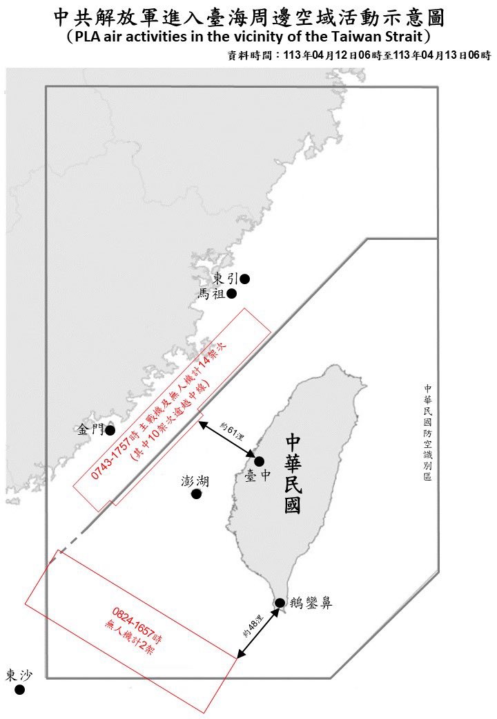 El Ministerio de Defensa taiwanés ha indicado que a las 6.00 horas (hora local) se ha registrado la presencia de 16 aviones alrededor de Taiwán y que doce de ellos han cruzado la línea media del estrecho de Taiwán y han entrado en la zona de identificación de defensa aérea de la isla.